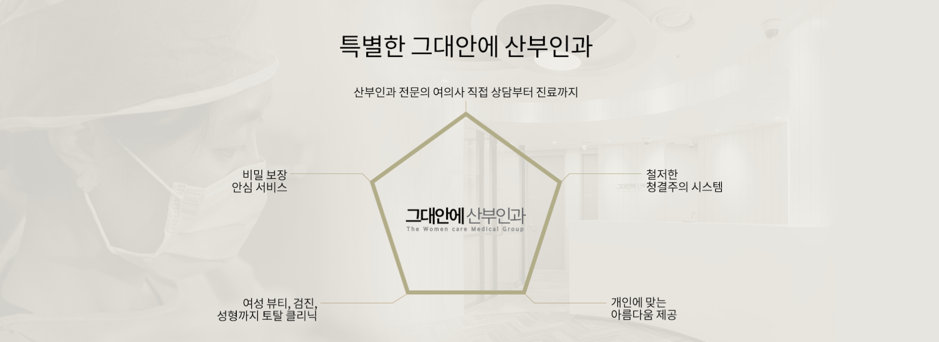 그대안에 산부인과는 삼성서울병원 출신 여성 전문의로 구성된 네트워크 산부인과로 아름답고 우아한 (여성)그대들을 위해 진심의 마음으로 정직하고 편안한 진료를 위해 최선을 다하고 있습니다.여성의 말 못할 고민과 질환들을 같은 여자의 마음으로 깊게 공감하며,단순한 진료와 치료를 넘어 여성의 아름다움과 자신감을 지켜드릴 수 있는 평생의 동반자가 되겠습니다.